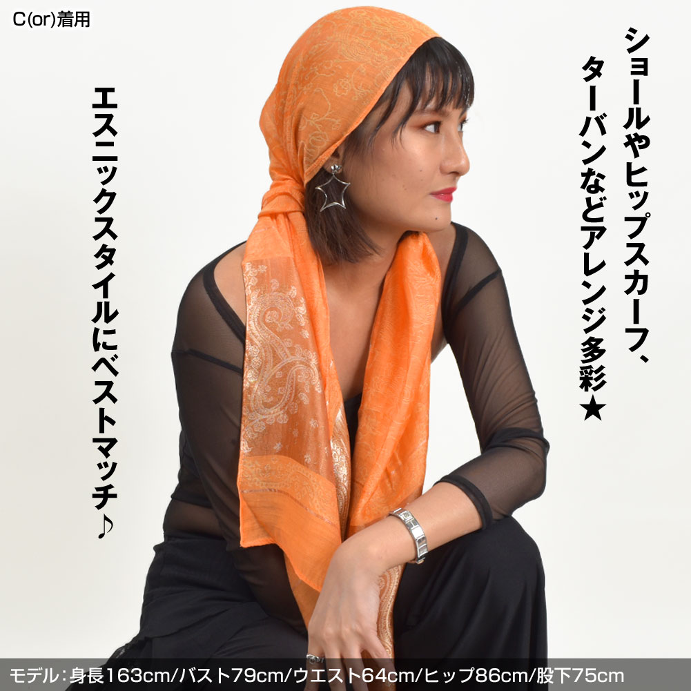 ■薄手で柔らかい手触りのシルク素材 ■肩を出せない時や肌寒い時のショールとして、ベリーダンスのヒップスカーフ、ヘッドターバンなど使い道がさまざまでエスニックスタイルにもベストマッチ♪
